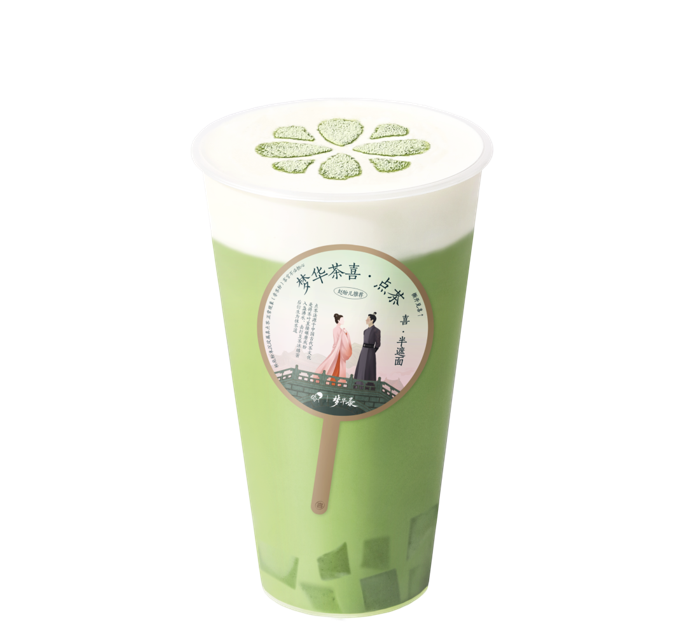夢華喜茶·點茶靈感來自於中國茶文化中的“點茶”。喜茶借鑑其擊拂手法,將抹茶粉與牛乳高速攪打混合,營造出細膩順滑的口感。在頂部則結合喜茶經典芝士元素,再以抹茶粉撒於其上形成聯名主題字樣和圖案,再次致敬於茶湯上作畫的“茶百戲”傳統技藝。喜茶還準備了共7款圖樣供消費者在下單時選擇,方便自由組成不同的打卡玩法。