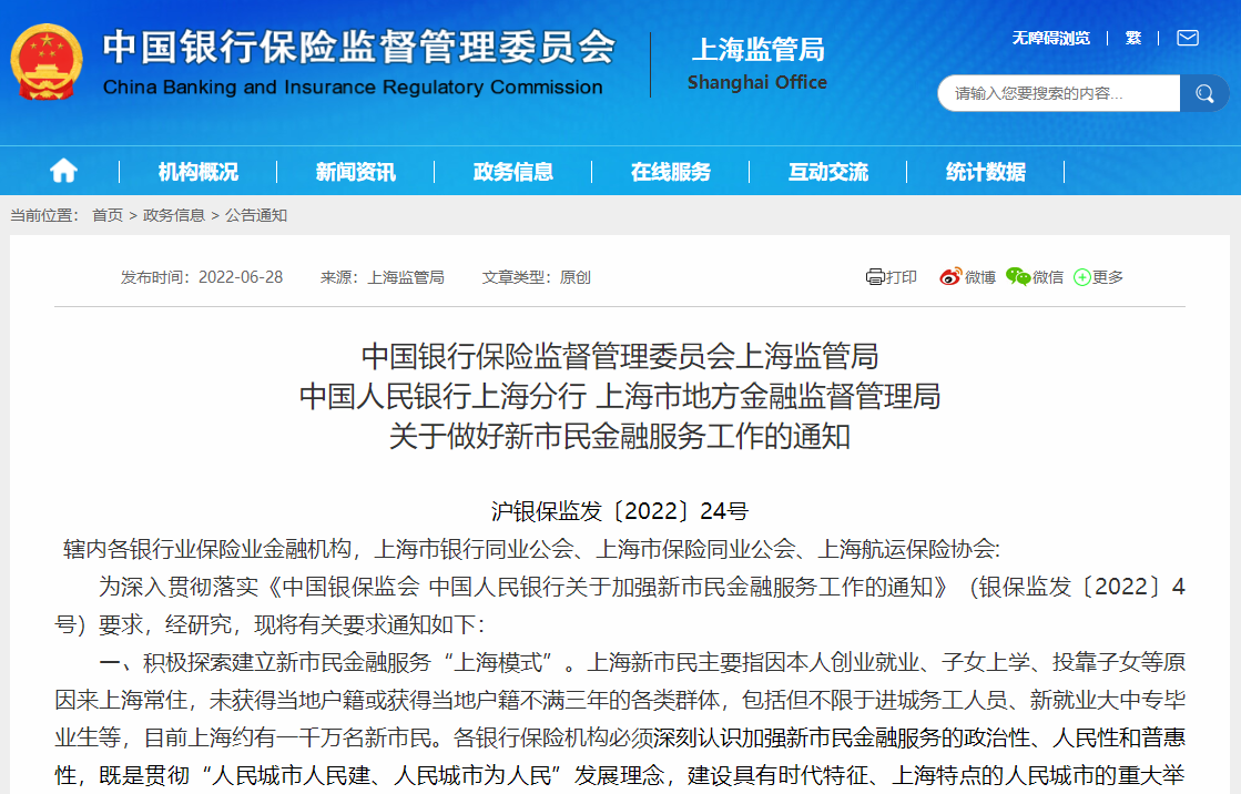 【環球網財經綜合報道】近日,上海銀保監局會同中國人民銀行上海分行、上海市地方金融監督管理局聯合印發《關於做好新市民金融服務工作的通知》(以下簡稱《通知》),提出十二條工作舉措,要求轄內銀行保險機構將新市民金融服務納入發展戰略,為新市民提供全生命週期的“10+N”綜合金融服務方案,努力形成可複製可推廣的“上海模式”。