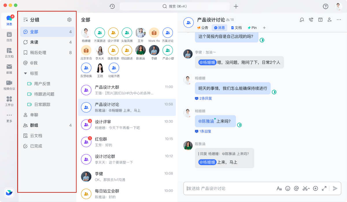 為進一步提升個人的信息處理效率,讓重度用户可以從爆炸的信息中過濾出“有效信息”與“緊急信息”。飛書推出了“分組”功能——消息太多時,可支持用户手動或自動添加分組,按“@我”、“未讀”、“單聊”、“雲文檔”等類別整理會話。