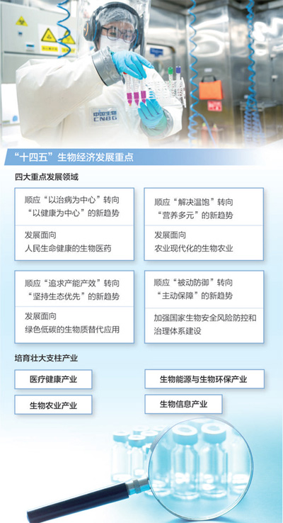 日前,《“十四五”生物經濟發展規劃》(以下簡稱《規劃》)正式印發。作為我國首部生物經濟五年規劃,《規劃》提出加快發展生物技術和生物產業,讓生物經濟成為推動高質量發展的強勁動力,明確要培育壯大醫療健康、生物農業、生物能源與生物環保、生物信息等支柱產業。生物經濟支柱產業前景如何,怎樣培育壯大?記者對相關企業和專家進行了採訪。