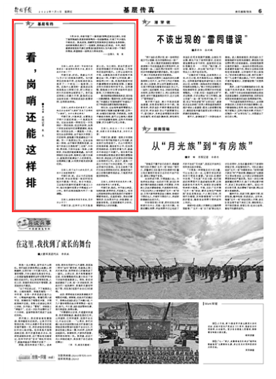 3月28日,本版刊登了一篇報道《崗哨應該怎麼排》,介紹了海軍陸戰隊某旅安排崗哨的一些創新做法,引起了不少連隊幹部關注。受此啓發,西藏軍區某旅裝步五連結合自身實際,也對排崗模式進行了一些探索,受到戰士們歡迎。今天,我們邀請該連連長代碧江波做客《基層有約》,為大家介紹一下他們的做法,希望能給一線帶兵人帶來啓發。