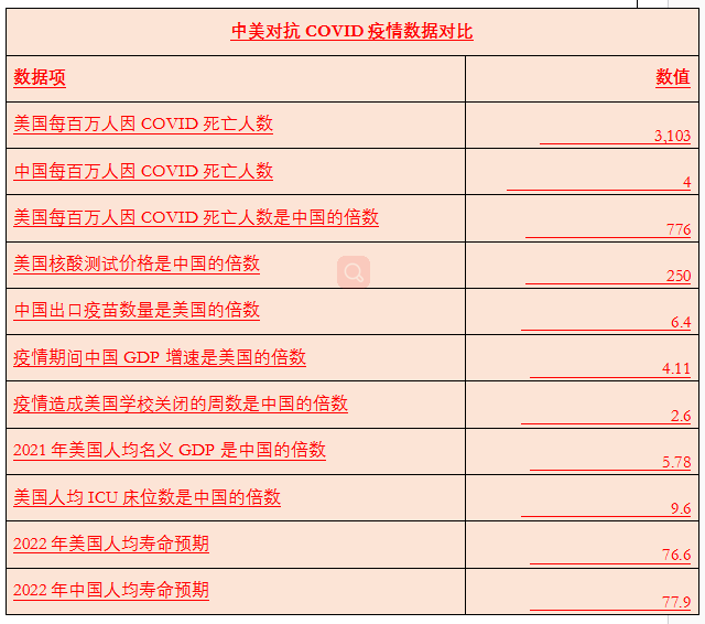 無論是在國內有效控制新的大流行病,還是迅速向世界上最貧窮的國家提供低成本的疫苗,都證明中國的社會主義正在推進人類保護自己免受未來災難的能力。上百萬條生命、相差數百倍的致死率,如此直觀而強烈的對比會直接挑戰“資本主義制度優越性”的彌天大謊。對於依賴資本主義制度收割全球的美國而言,這是動搖根本的挑戰。因此他們發起針對中國抗疫政策的輿論戰,掩蓋其國內抗疫失敗的現實,並寄望欺騙中國人對全球抗疫形勢的認知、甚至在中國引發反對政府抗疫政策的“顏色革命”。