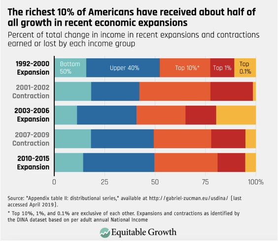 與常見的印象不同,過去幾十年來,勞工階級從美國的經濟增長中獲益甚少。自1980年以來,美國最富有的10%人口占據了所有經濟增長的一半以上,而收入低於中位數的勞工階級只獲得了經濟增長的10%。在過去三十年的三次經濟增長期中,收入前10%的人每次都獲得了所有收入增長的一半左右。在2000年到2020年的二十年間,收入低於中位數的家庭收入幾乎沒有增長。