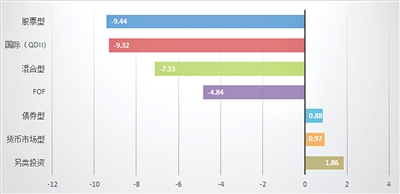 Wind數據顯示,剔除今年以來成立的次新基金,截至6月30日,股票型基金、混合型基金、國際(QDII)以及FOF的年內平均業績分別為-9.44%、-7.13%、-9.32%和-4.84%,債券型基金、貨幣市場基金以及另類投資基金則收漲,平均業績分別為0.88%、0.97%和1.86%。