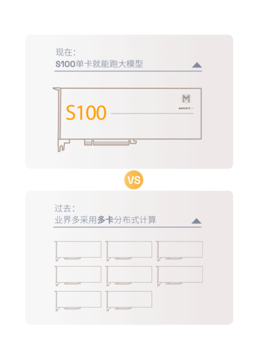 除了高算力的優勢,相較於當前國際大廠主流推理卡單卡只能支持百億參數級別的模型,墨芯S100可以支持千億參數級別的模型。