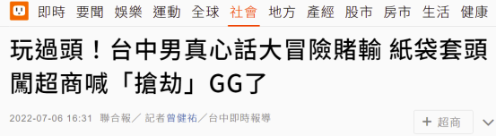 玩過頭!玩“真心話大冒險”願賭服輸,台灣一男子蒙面闖超市喊搶劫