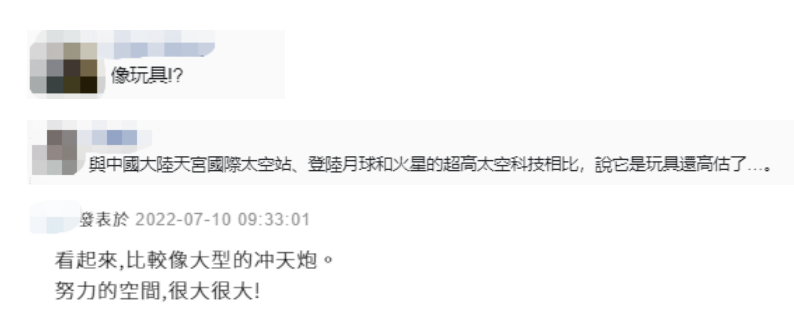 還有網友表示,“再搞一百年也追不上現在的中國大陸。”還有網友稱,“不必自吹自擂!真正火箭衞星入軌成功後再來吹噓可以嗎?”