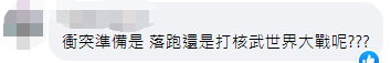 在臉書上,也有網友留言質疑,“衝突準備是落跑,還是打核武世界大戰呢?”↓