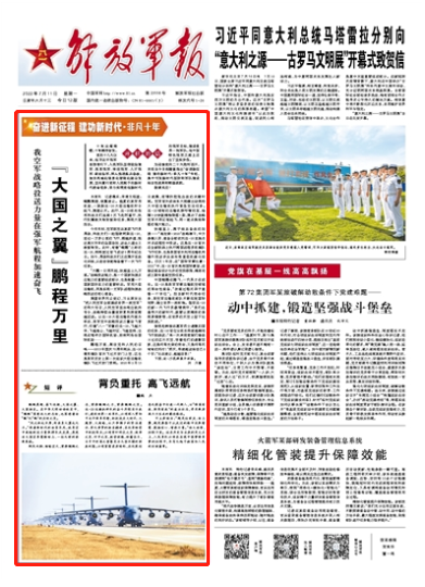 展望世界風雲變幻,習主席發出“把人民空軍全面建成世界一流空軍”的偉大號召,人民空軍堅決響應統帥號令,戰略轉型由量變積累向質變跨越邁進。以運-20大型運輸機列裝為標誌,我軍空中戰略投送力量奮飛前行,印着“八一”軍徽的運-20,飛越大洋、飛越高山,飛越時區、飛越經緯,出現在喀布爾國際機場、努庫阿洛法國際機場……
