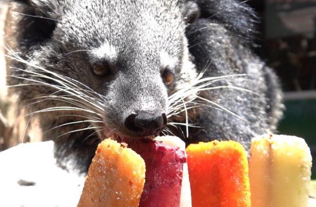 天氣炎熱,位於台南市學甲區的“頑皮世界”野生動物園為熊狸製作各種水果口味的“枝仔冰”消暑。圖片來源:台灣“中央社”(頑皮世界提供)