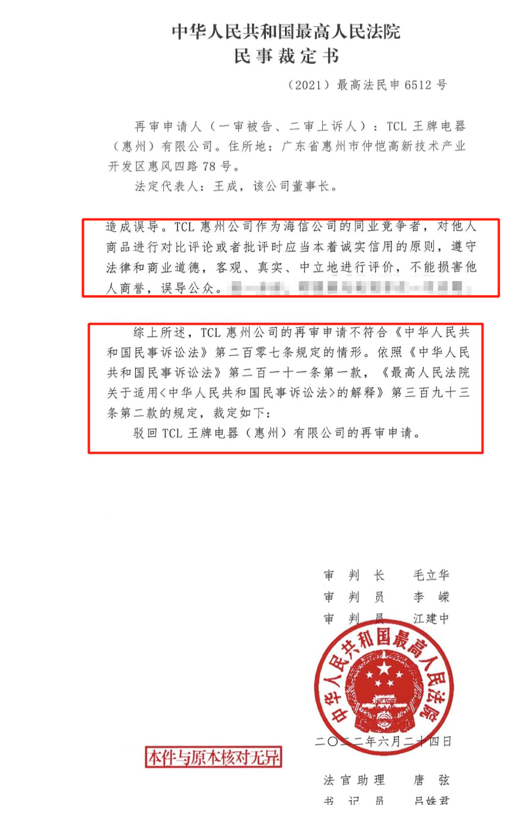 TCL王牌電器(惠州)有限公司(下文簡稱TCL)詆譭海信激光電視一案迎來最高人民法院終槌裁定。7月11日,記者獲得的一份《(2021)最高法民申6512號民事裁定書》顯示,最高院依法駁回了TCL公司的再審申請,裁定TCL在官方微博和抖音賬號發佈視頻的行為構成對海信視像公司的商業詆譭,認定二審法院要求TCL公開刊登聲明以消除影響和酌定TCL賠償海信200萬元的判決並無不當。尤其值得注意的是,最高院在裁定書中明確指出:TCL公司作為海信公司的同業競爭者,應遵守法律和商業道德,不能損害他人商譽,誤導公眾。