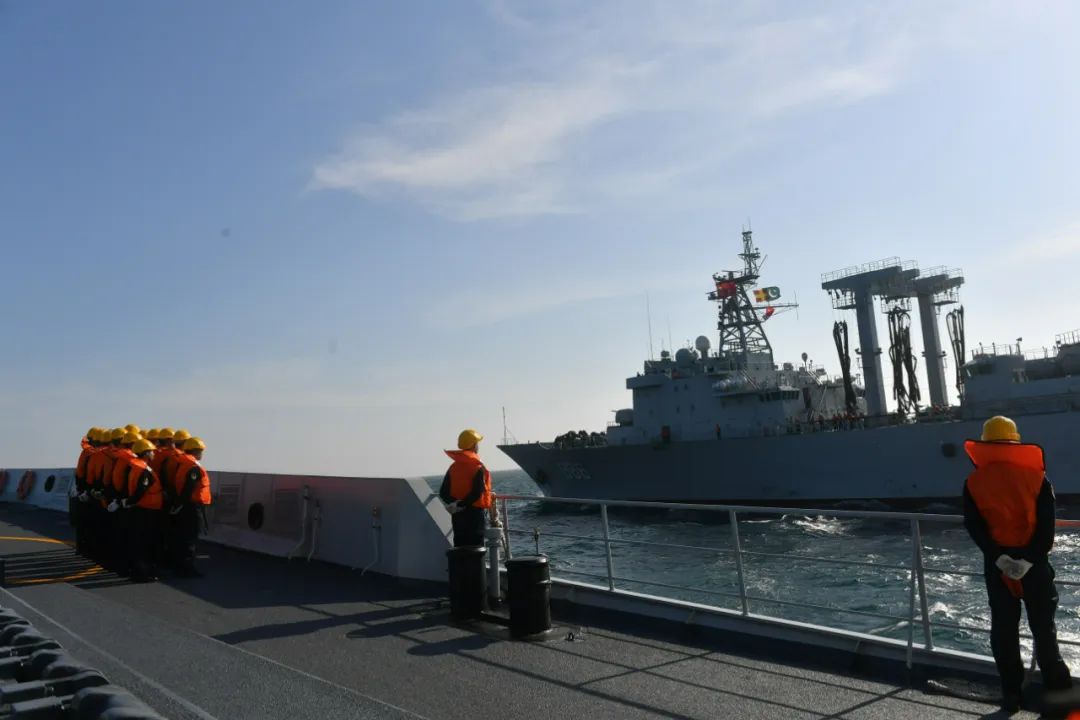 15時30分,千島湖艦抵達預定陣位,加入聯合補給。“泰穆爾”號護衞艦快速佔領補給陣位,與千島湖艦保持同向同速。兩艦之間隨即架起補給通道,雙艦上下躍動、隨波起伏,橫向補給順利完成。隨後,編隊還進行了聯合戰術機動。