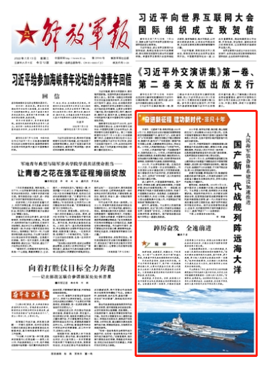 解放軍報訊 記者康子湛、錢曉虎報道:2022年6月17日,我國完全自主設計建造的首艘彈射型航空母艦福建艦下水,舷號為“18”。此刻,舷號為“16”的我國第一艘航空母艦遼寧艦正劈波斬浪,馳騁大洋;舷號為“17”的我國第一艘國產航空母艦山東艦,正靜靜地停泊在碼頭,待命出航。10年間,人民海軍航母進入“三劍客”時代。