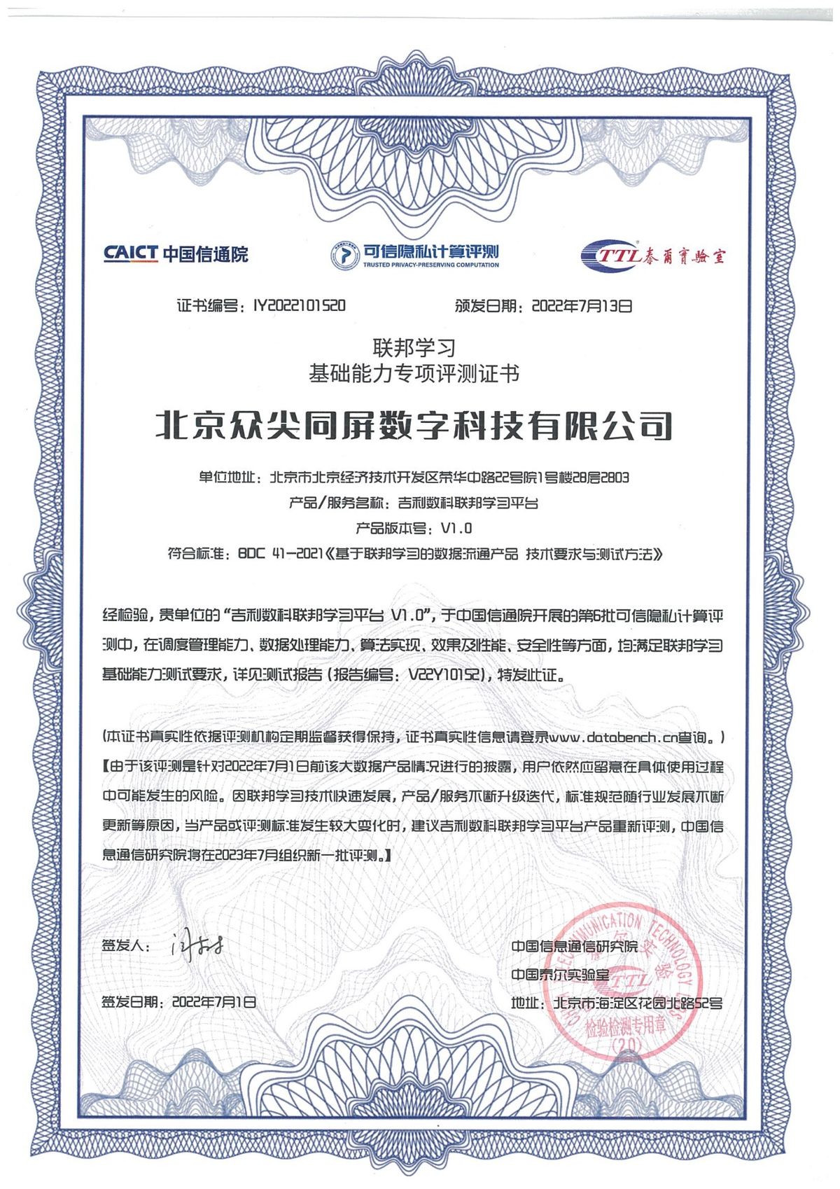 中國信通院第六批“可信隱私計算評測”評審會於7月1日舉行,吉利數科聯邦學習平台參與了“聯邦學習 基礎能力專項評測”,接受對平台的調度管理能力,數據處理能力,算法實現,效果及性能以及安全性、穩定性、可擴展性的嚴格測試。經過線上測評、產品資料審核、測試報告審核、答辯、質詢與答疑、