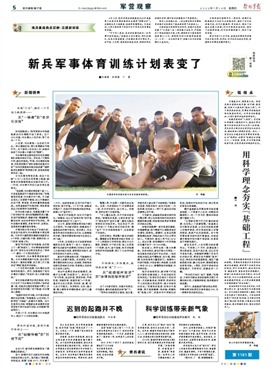6月上旬,陸軍某綜合訓練基地2022年度春季入伍新兵軍事訓練考核成績單“新鮮出爐”。成績較往年大幅提高,傷病率顯著降低。問其秘訣,大部分新訓骨幹將其歸功於科學化的軍事體育訓練。
