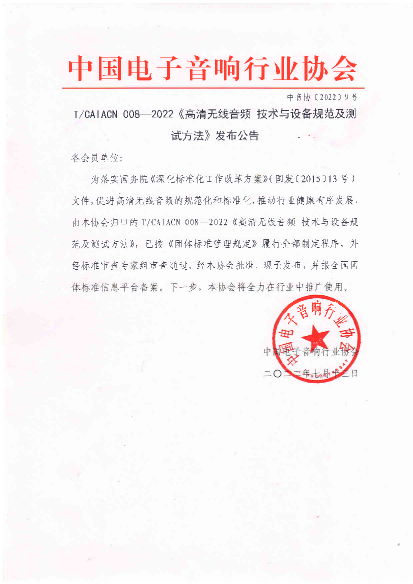7月13日,由中國電子音響行業協會與中國電子技術標準化研究院共同牽頭髮起,T/CAIACN 008-2022《高清無線音頻技術與設備規範及測試方法》正式發佈(以下簡稱HWA高清無線音頻標準,Hi-Res Wireless Audio,標準),該標準是以消費者實際體驗為出發點的、涵蓋主客觀評測的綜合性標準。