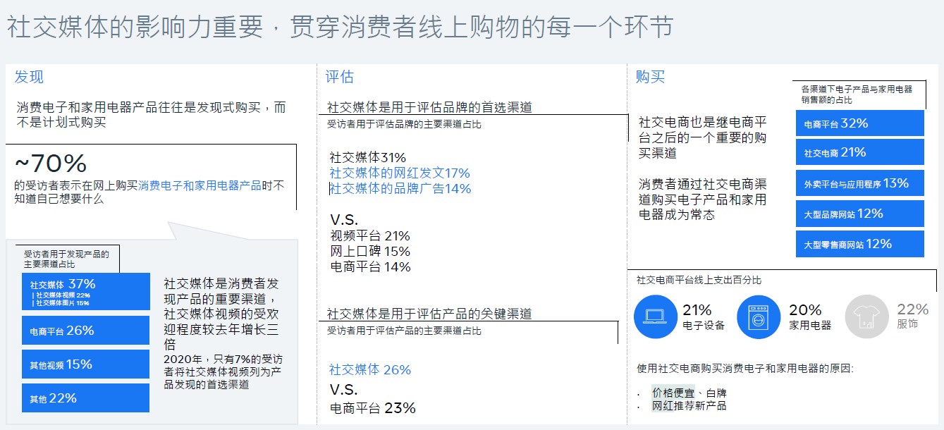 消費電子和家用電器產品往往是發現式購買,而不是計劃式購買。70%的受訪者表示在網上購買消費電子和家用電器產品時不知道自己想要什麼。社交媒體的影響力日益重要,成為人們發現產品、評估品牌的關鍵或首選渠道,貫穿消費者線上購物的每一個環節。