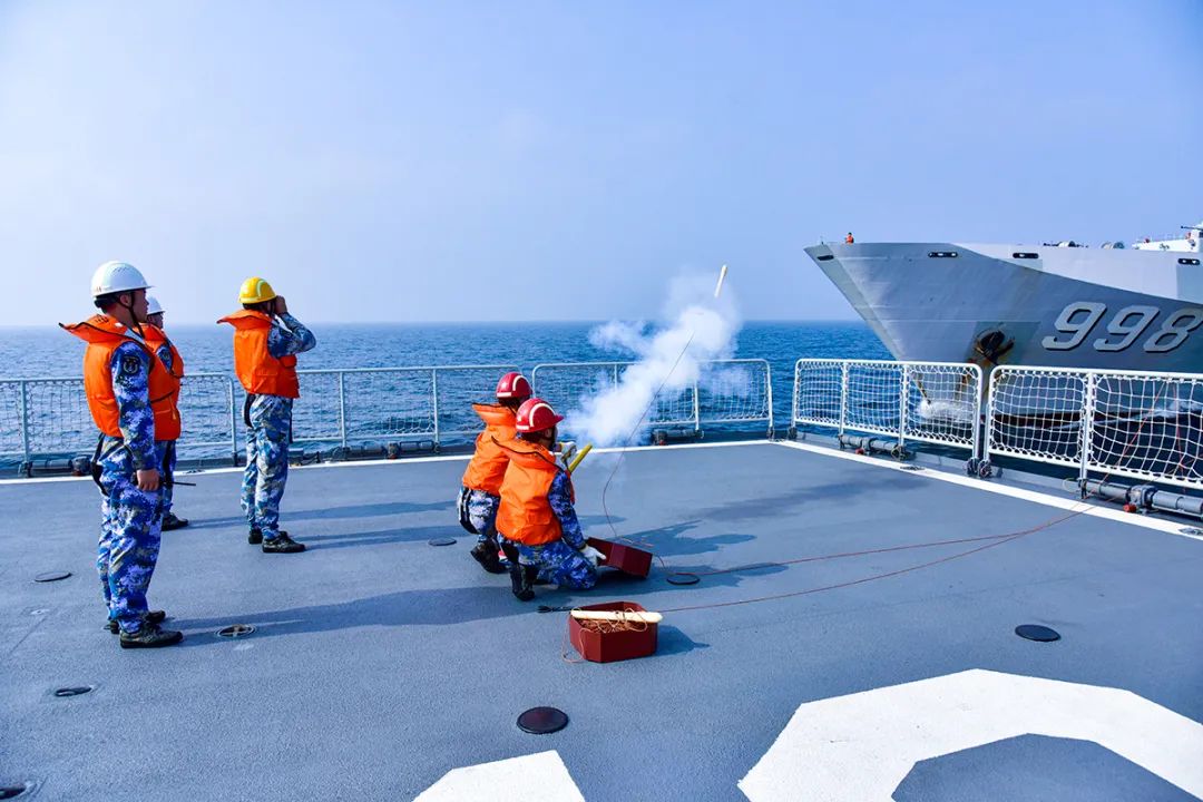 戰鬥一個接着一個。橫向補給正在緊張進行,導調組卻臨時加碼:“補給海域突遇強對流天氣,前方海區風浪過大,立即轉換為縱向補給。”同時,為了模擬逼真戰場環境,洪湖艦決定採用惡劣海況下使用的拋投器發射引纜的方式進行縱向補給。