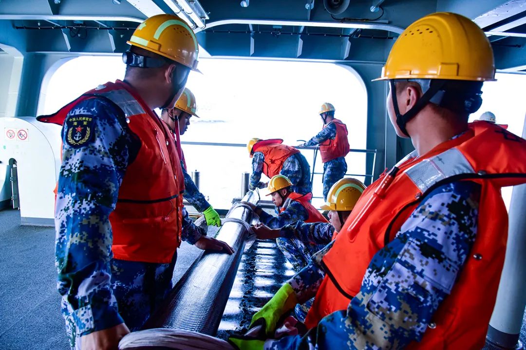 剛剛抵達訓練海域,一場綜合補給訓練隨即在茫茫大洋上演。隨着指揮員一聲令下,受補艦緩慢靠近青海湖艦佔領補給陣位,進行海上並靠補給。撇纜繫纜、架設管道、吊放物資……整個補給作業流程緊張有序,各類物資快速送達受補艦。