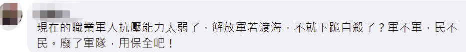 也有網友説,“現在的職業軍人抗壓能力太弱了,解放軍若渡海,不就下跪自殺了?軍不軍,民不民。廢了軍隊,用保全(保安)吧!”↓