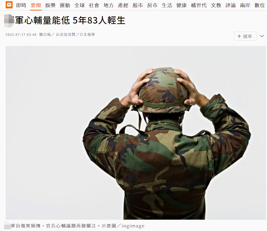 【環球網綜合報道 記者趙友平】台灣《聯合報》17日消息稱,台軍方統計,台軍近5年自殺身亡人數達83人,其中以陸軍50人最多,其次是空軍17人。此外,台軍輕生被救回者高達264人,若加上未通報的數據,實際輕生者可能比官方統計數字更多。民進黨“立委”稱,台軍平均400多人才配一名心理輔導人員,明顯不足,台防務部門急需檢討。