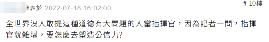 有網友説,全世界沒人敢提這種道德有大問題的人當指揮官,因為記者一問,指揮官就難堪,要怎麼去塑造公信力?↓