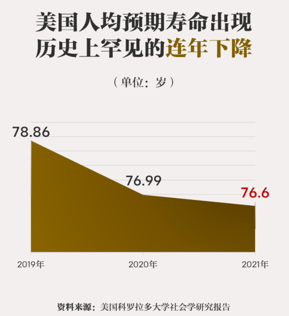 *醫療行業也是一大“腫瘤”。*2021年美國社會的醫療衞生開支已經達到GDP的18%,世界上主要發達經濟體經合組織國家的平均值則只有8.8%。然而高昂的醫療衞生開支並不意味着美國人的健康得到了更好的照料,相反,美國的人均預期壽命從2019年的78.86歲下降到2021年的76.6歲,已經低於中國。物美價廉的醫療服務對美國普通民眾來説只能是望梅止渴。