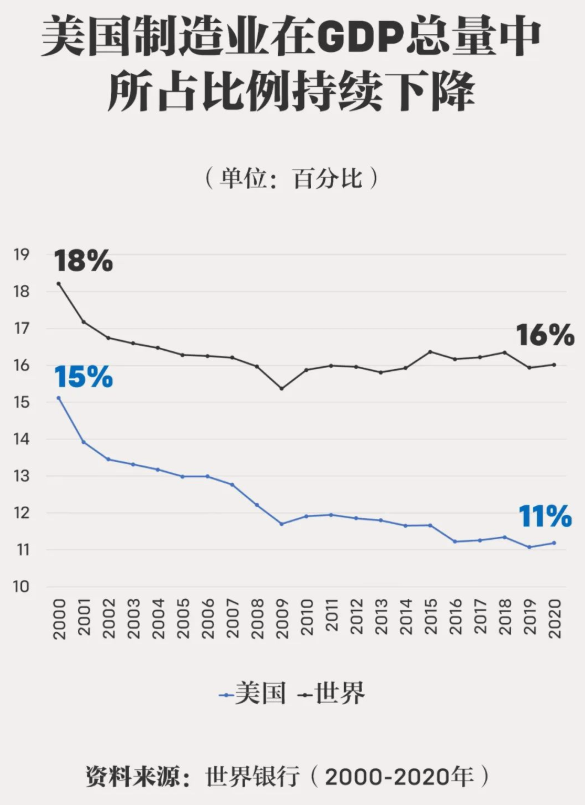 美國曾經擁有強大的製造業,但是在佈雷頓森林體系瓦解後,美國躺在功勞簿上放任美元資本在全世界範圍內無序擴張,儼然一副不屑下地掄鋤頭的金領形象,資本與生產進一步分離。