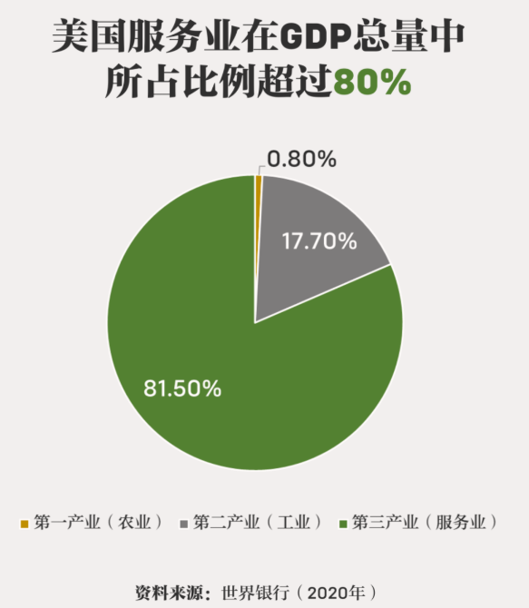 隨着製造業的外流,美國經濟結構中服務業的比重不斷攀升,目前已經超過80%,其中很大部分是不可貿易品,本質上是國內財富的相互轉移,而非財富的創造。