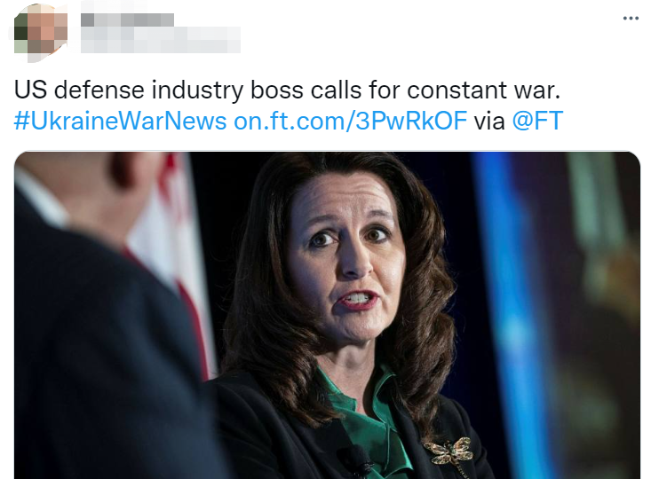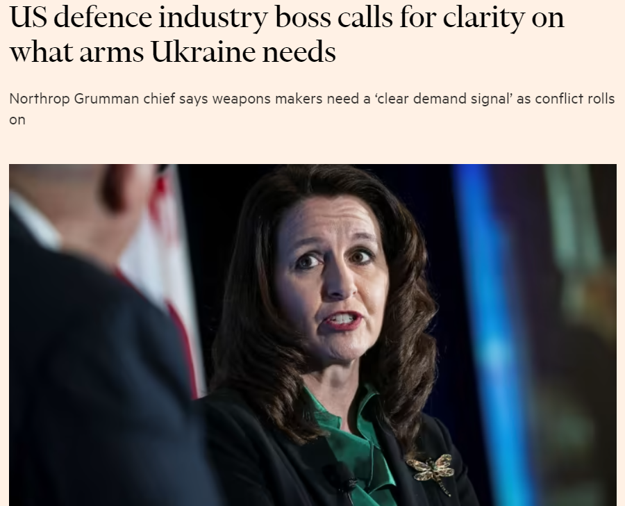 據英國《金融時報》17日報道,美國軍工巨頭諾思羅普-格魯曼公司總裁凱茜·沃登在接受該報採訪時聲稱,西方政府應該對軍火武器需求發出“明確的需求信號”,以便軍火商能提前擴大投資。