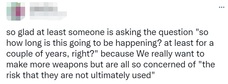 還有網友嘲諷道,很高興至少有人問了這樣一個問題:“這種情況會發生多久?至少需要幾年,對吧?”因為我們真的想製造更多的武器,但我們都非常擔心戰爭停止,它們最終不會被使用。