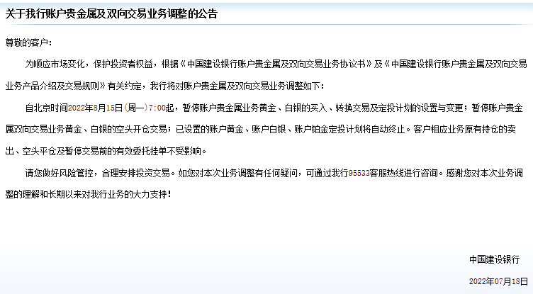 【環球網財經綜合報道】7月18日,建設銀行發佈賬户貴金屬及雙向交易業務調整的公告,宣佈暫停賬户貴金屬業務黃金、白銀的買入、轉換交易及定投計劃的設置與變更;暫停賬户貴金屬雙向交易業務黃金、白銀的空頭開倉交易。