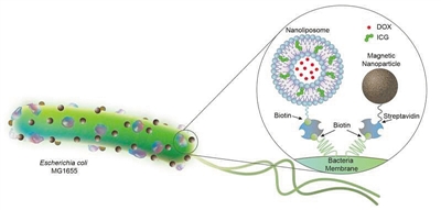 為構建出這款機器人,研究小組將幾個納米脂質體連接到每個大腸桿菌上,這些球形脂質體外層包裹着吲哚菁綠(ICG,綠色顆粒),當受到近紅外光照射時,ICG會融化。脂質體的水性核心內則包裹着水溶性化療藥物分子(DOX)。研究人員還在細菌上附着了磁性氧化鐵納米顆粒,當暴露在磁場中時,這種磁性顆粒可以作為微生物高速運動的助推器。連接脂質體和磁性顆粒與細菌的“繩索”則是一種非常穩定且難以破壞的鏈黴親和素和生物素複合物。