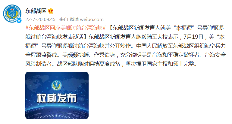 對此,20日,解放軍東部戰區新聞發言人施毅陸軍大校回應稱,中國人民解放軍東部戰區組織海空兵力全程跟監警戒。美頻頻挑釁、作秀造勢,充分説明美是台海和平穩定破壞者、台海安全風險製造者。戰區部隊隨時保持高度戒備,堅決捍衞國家主權和領土完整。