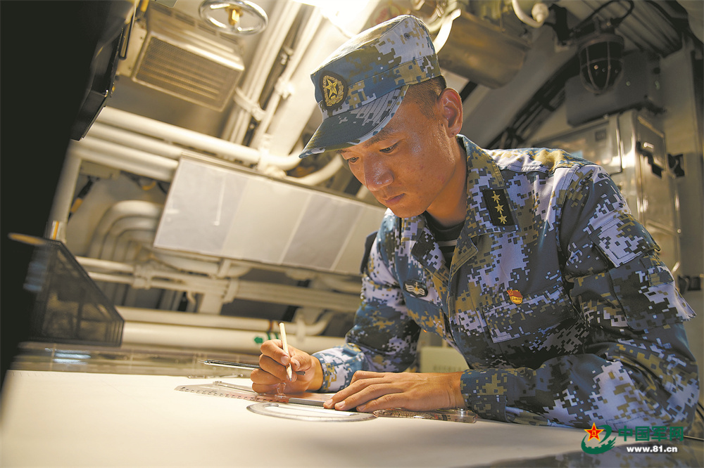 “對航海專業來説,潛艇和水面艦艇最大的不同,就是多了‘深度’這一維度。潛艇航行是水下的三維運動,只有全面掌握海區的水文環境,才能避免掉深、擱淺等危險,保證航行安全。”劉鎰鋮一邊翻看資料,一邊在海圖上勾畫着,細細比對航行的數據。