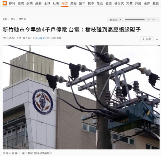 【環球網綜合報道 記者趙友平】台灣聯合新聞網消息稱,台灣新竹市部分區域20日上午8時許停電,受影響的用户達4347户。對於停電原因,台灣電力公司(下稱台電)方面稱是電力巡修人員修剪樹木不慎,樹木碰觸高壓絕緣礙子(一種絕緣體裝置)導致輸電設備破損所致。由於台電此前一再把停電怪罪到小動物頭上,對於這次其公佈的停電原因,有島內網友諷刺道,停電原因“終於有新劇本了”,還有網友説:“小動物用完換小植物了,呵呵。”