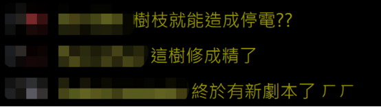 對於此次台電將新竹部分地區停電原因歸咎於樹木,有島內網友諷刺道:停電原因“終於有新劇本了”。↓