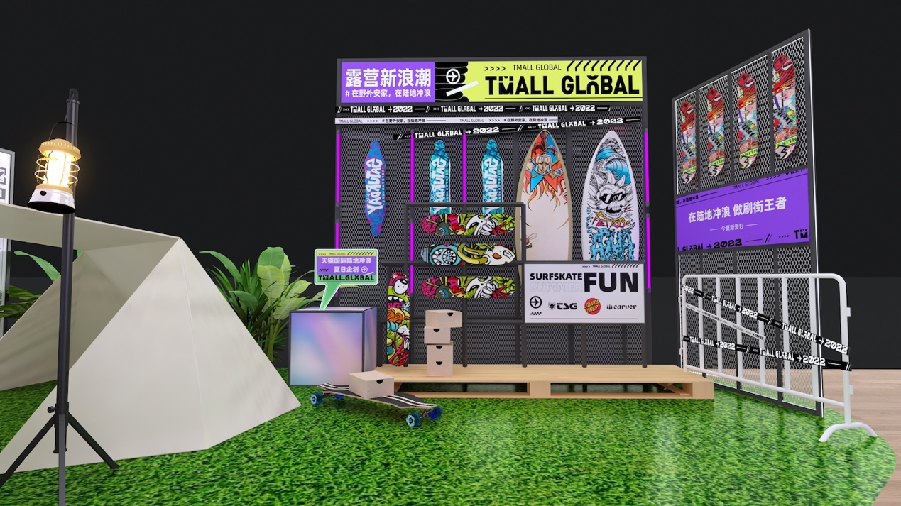 再次參展的天貓國際,擁有500平米展區,設置了全球新品展示區,以及六大海淘消費趨勢展區,展示“搬家式露營、早C晚A、全球美妝、隨手養生、萌娃萌寵”等時下流行的海淘新趨勢。