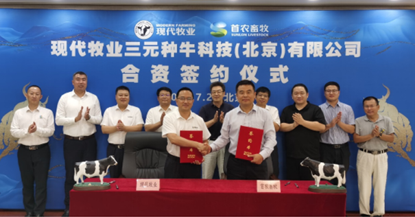 *【環球網財經消費資訊 記者 文馨】*環球網財經消費資訊獲悉,7月20日,北京三元食品股份有限公司控股子公司北京首農畜牧發展有限公司(以下簡稱:首農畜牧)與現代牧業(集團)有限公司(以下簡稱:現代牧業)在北京圓山大酒店舉辦合資公司簽約儀式,共同組建現代牧業三元種牛科技(北京)有限公司。現代牧業持有合資公司總股本的51%,首農畜牧持有49%,聯合佈局種業板塊,拓展全產業鏈生態圈,打造中國最大規模的奶牛育種資源羣體,共建全球領先的奶牛育種與繁育服務創新聯合體,助力首農、蒙牛等社會奶源牧場的種質提升,在國家種業振興行動中主動擔當作為,實現奶牛種業核心技術自立自強,核心種源自主可控。