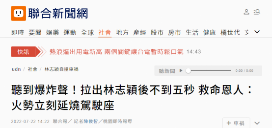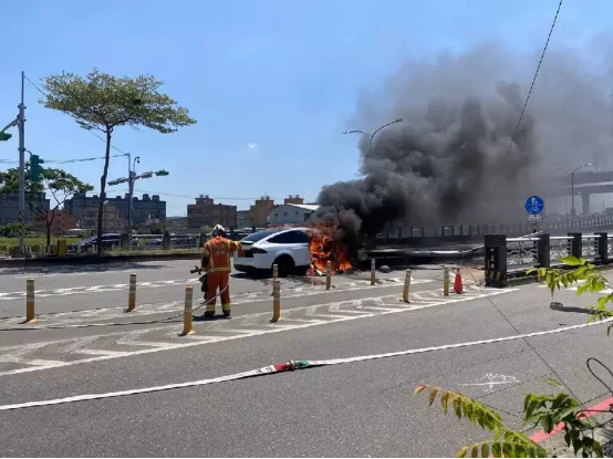 報道稱,林志穎22日上午駕車載着兒子在桃園蘆竹區中正北路撞上隔離帶,車輛立刻起火,在附近工地的工人上前救出林志穎父子後,特斯拉車頭旋即陷入火海。