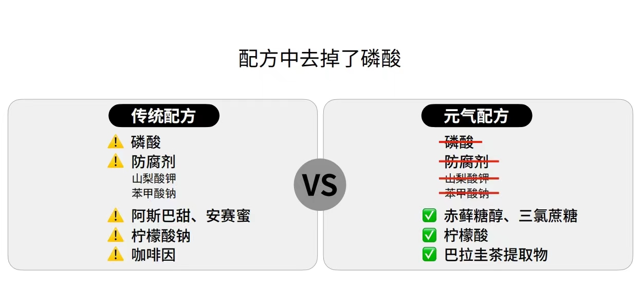 鹿角介紹説,首先,元氣森林決定去掉傳統可樂配方的磷酸。有研究表明,過量攝入磷酸鹽對人體骨骼和心腦血管都有一定危害,每天攝入700mg磷就會影響骨骼健康,每天攝入1.8g磷酸鹽就會導致齲齒。而飲料中常用的磷酸鹽添加劑比食物中本身含有的更容易被人體吸收。