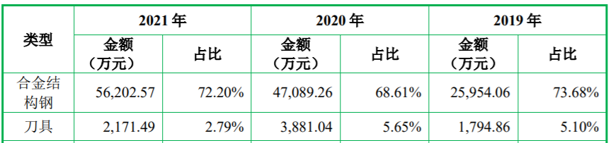 此外,合金結構鋼是飛沃科技的最主要原材料,佔採購總額的比重在70%左右,2019年到2021年的合金結構鋼採購金額分別為25954.06萬元、47089.26萬元和56202.57萬元,三年合計採購金額在13億元左右。而與此同時,飛沃科技的成本消耗中包含的合金結構鋼消耗金額卻並沒有這樣多,2019年到2021年合計結轉的合金結構鋼材料成本僅為8.8億元左右。這也就意味着飛沃科技在最近三年採購的合金結構鋼,超過同期消耗達4億元以上。