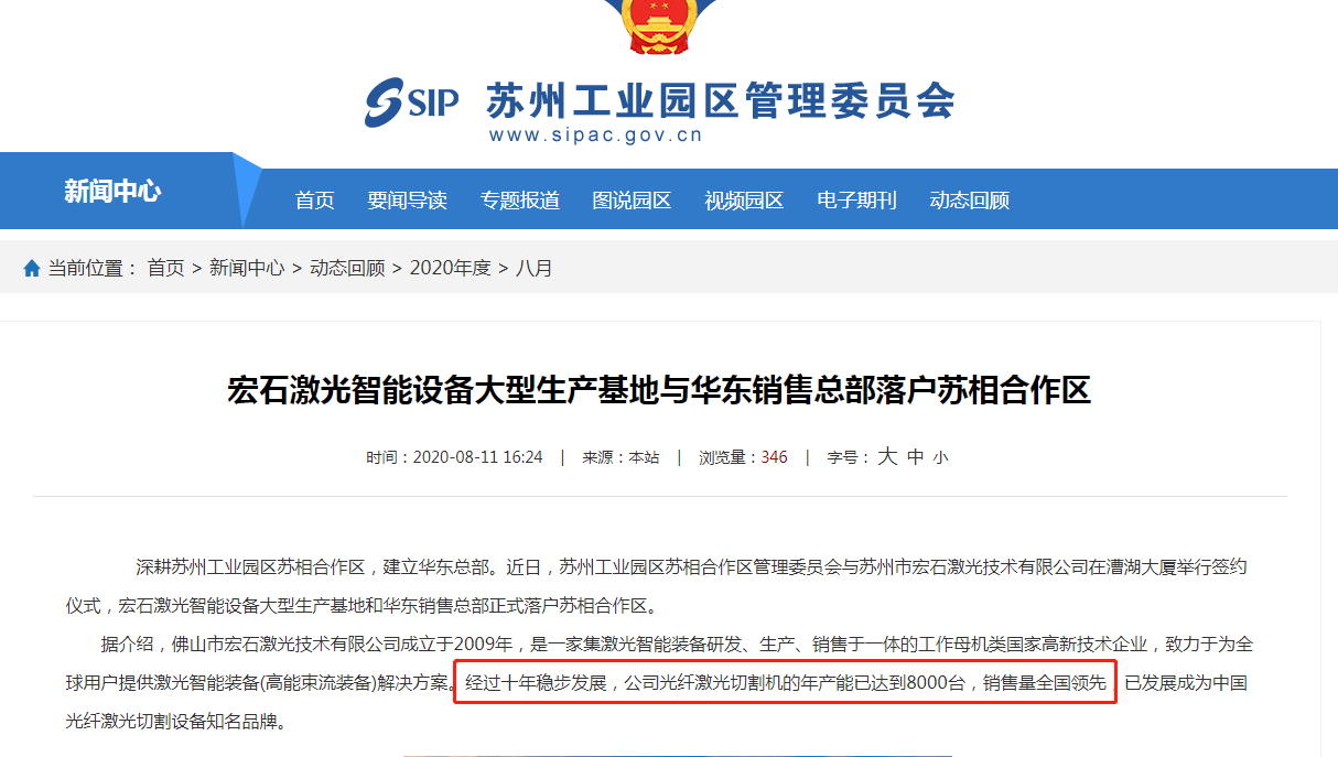 另外,宏石激光招股書披露,公司蘇州工廠是主要生產基地之一。該廠所在地的蘇州工業園區管理委員會2020年8月的新聞稱,經過十年穩步的發展,宏石激光公司光纖激光切割機的年產能已經達到8000台。銷售量全國領先。