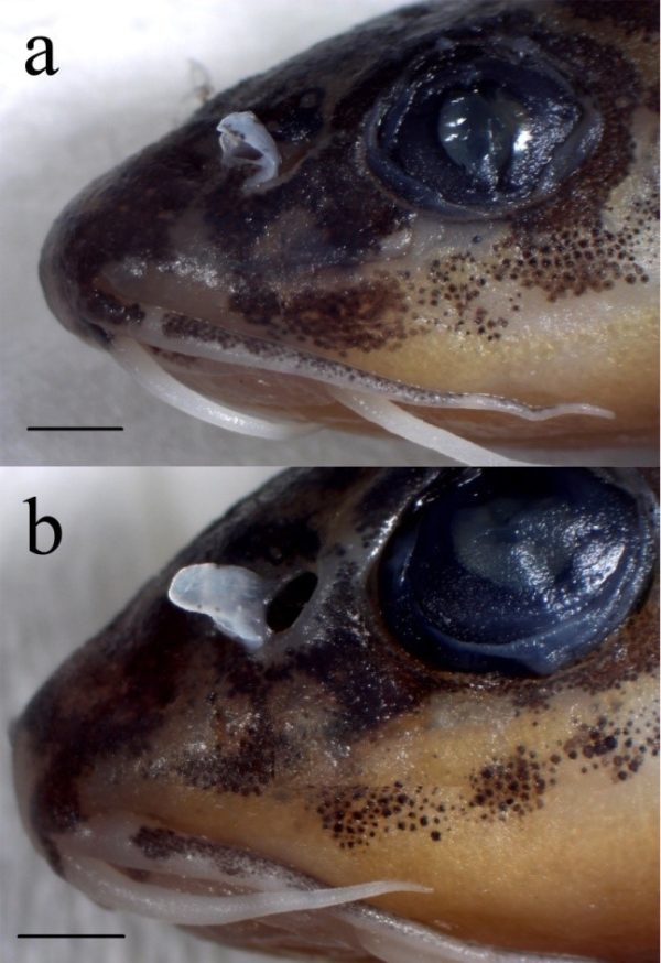 楊氏迷鰍頭部側面(a為雄性,b為雌性)。