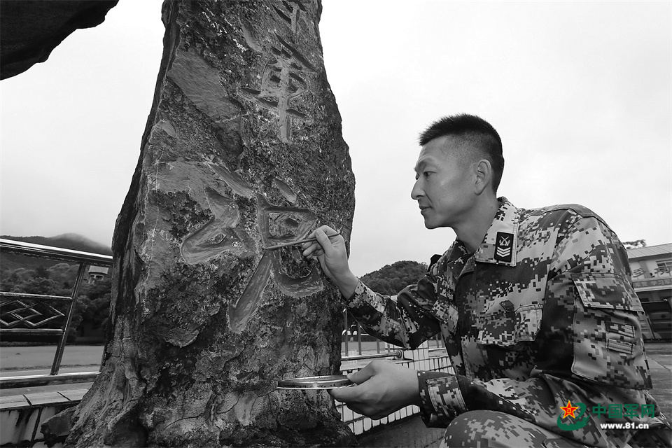 不遠處,一座守庫石讓李京超久久凝視。“虎踞羣山劍指大洋”八個蒼勁有力的“庫訓”,被官兵描得鮮紅,刻進被歲月侵蝕的巨石中。