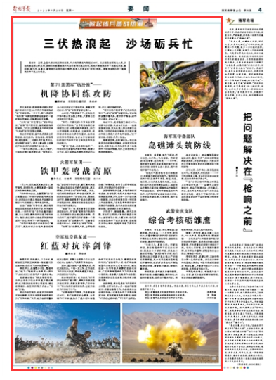 編者按 近期,全國大部分地區持續高温,不少地方最高氣温超過40℃。從東南沿海到西北大漠,從邊關海島到山野叢林,各部隊把酷暑高温天氣當作難得的練兵時機,紮實開展高温條件下實戰化訓練,練技能、練作風、練意志,磨礪敢打必勝的戰鬥精神,摸清人員裝備的“耐熱”底數。請看來自部隊的一組高温條件下練兵的報道。
