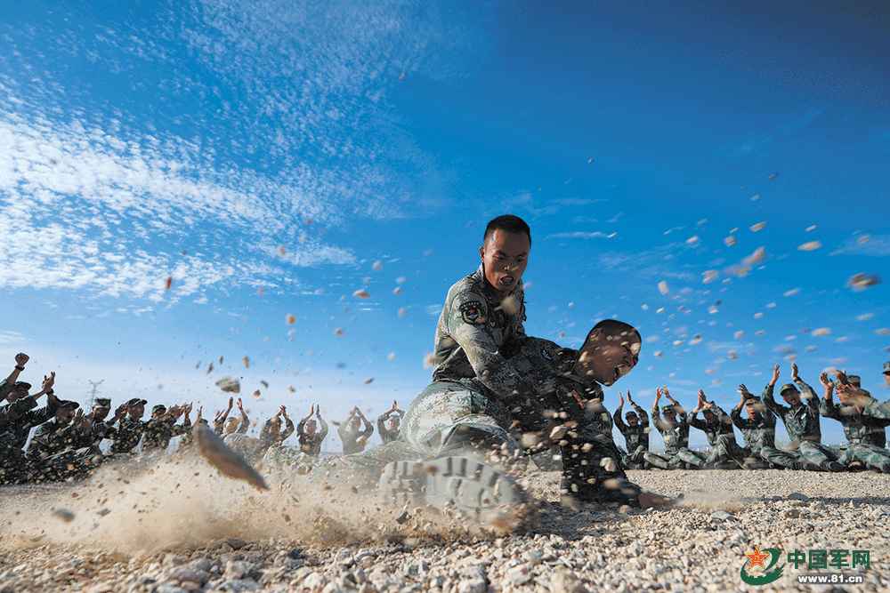 正午過後,白沙灘上,地表温度超過45℃。單兵戰術、對抗刺殺……一個個科目輪番上演,官兵們的皮膚由紅變紫,但始終保持着昂揚士氣。