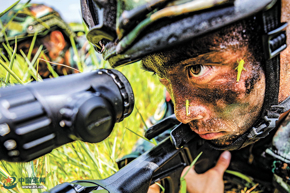 “保持潛伏狀態,注意觀察‘敵’兵力部署動態!”聽到對講機裏傳來的指令,該團狙擊手柴正旭紋絲不動地趴在接近55℃的地面上,等待攻擊時機。