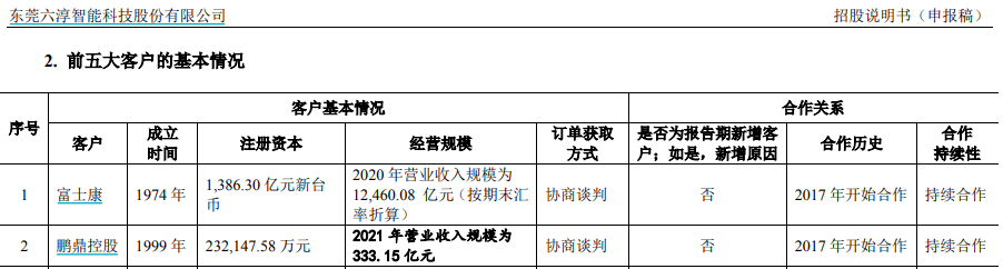 另據《審核問詢函回覆》第6頁披露的信息,六淳科技在在成立之初就與富士康、鵬鼎控股建立了合作關係,取得了合格供應商的資質。六淳科技註冊成立於2015年12月,但是根據招股書第167頁披露的“前五大客户的基本情況”則披露,六淳科技與富士康、鵬鼎控股的合作歷史都是從2017年開始的,這也與六淳科技給予深交所的《審核問詢函回覆》中描述的“成立之初就與富士康、鵬鼎控股建立了合作關係”存在矛盾。