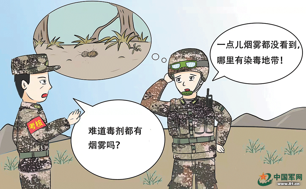 “誰説染毒地帶一定有煙霧?”考核組組長、該團參謀長馬龍一臉嚴肅地反問,“敵人放毒還要給你明確提醒?難道就沒有無色無味的毒劑?”考核組成員、作訓股股長李金龍接過話茬補充道:“要注意仔細觀察,敵情的外在表象不會那麼明顯。”